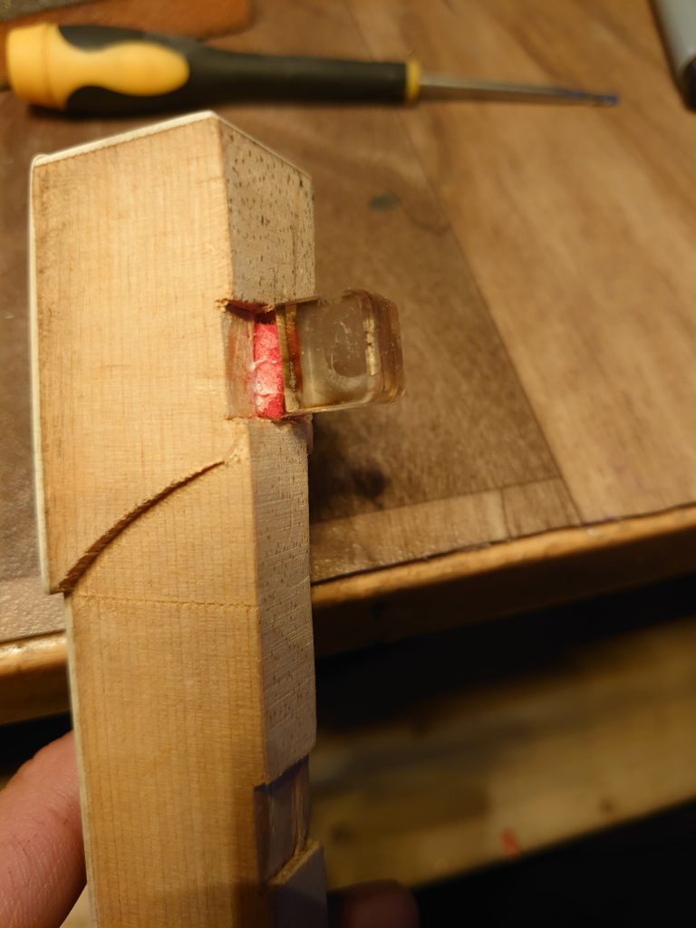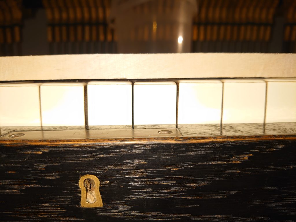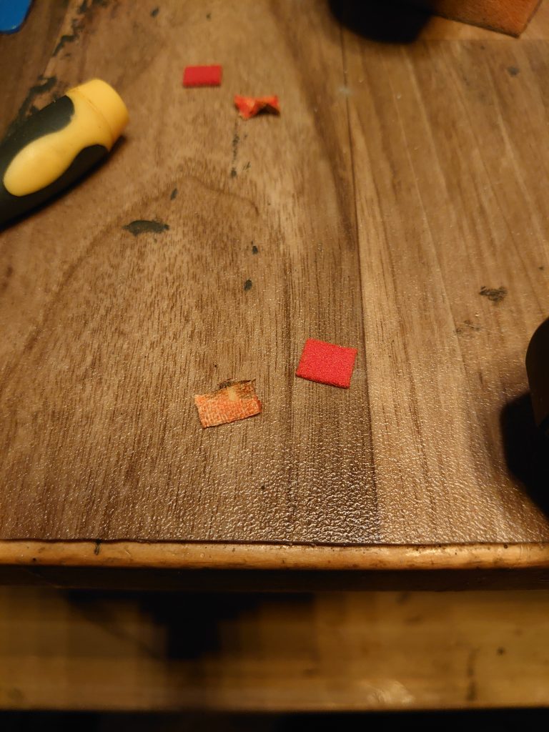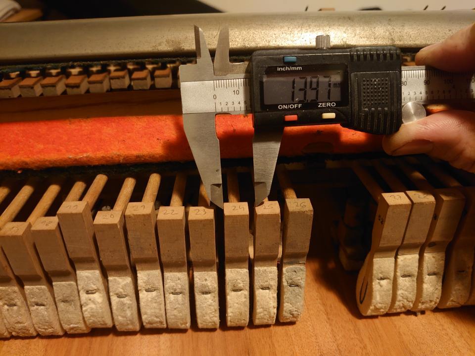 It was necessary to clean the keys of the old felt.Old vs new feltGluing new felt into the key. The plexiglass jig ensured the gap was the correct size.Each key had two such spots.On many keys, the celluloid tops were peeling off. I glued the detached pieces back on and then lightly sanded the keys.After assembly, each key is at a different height.