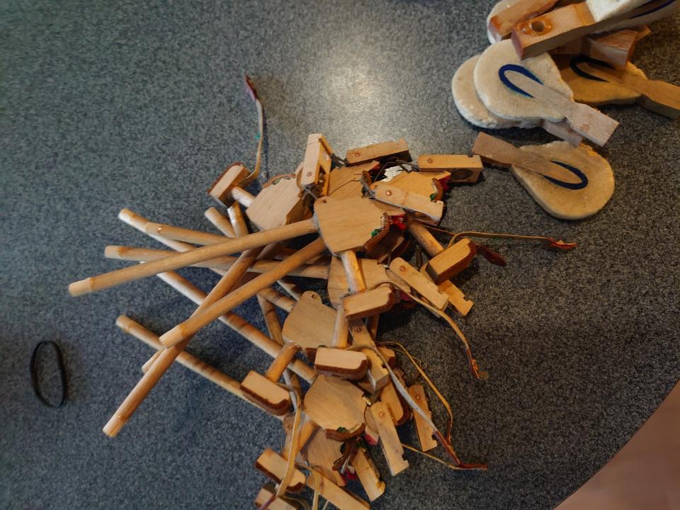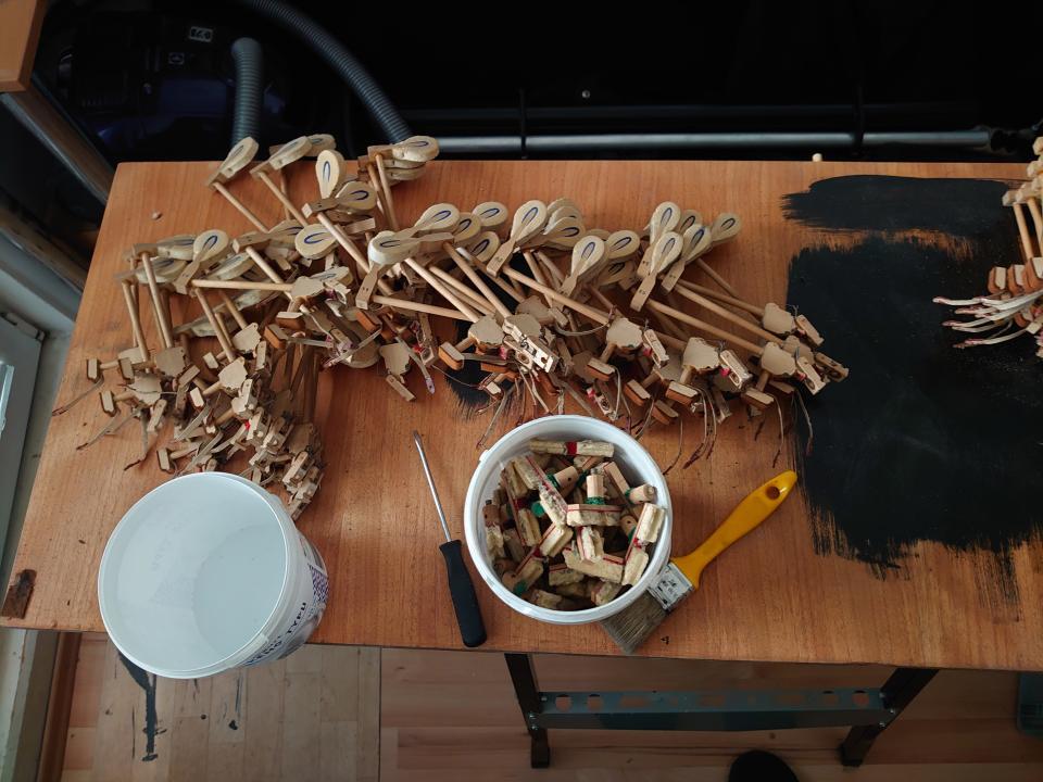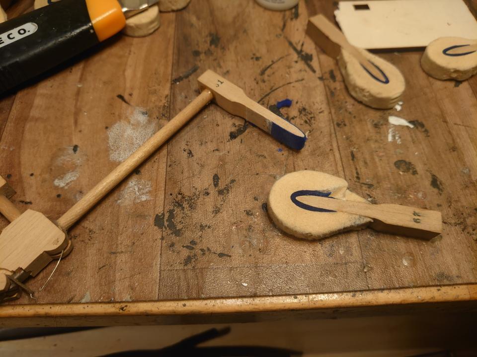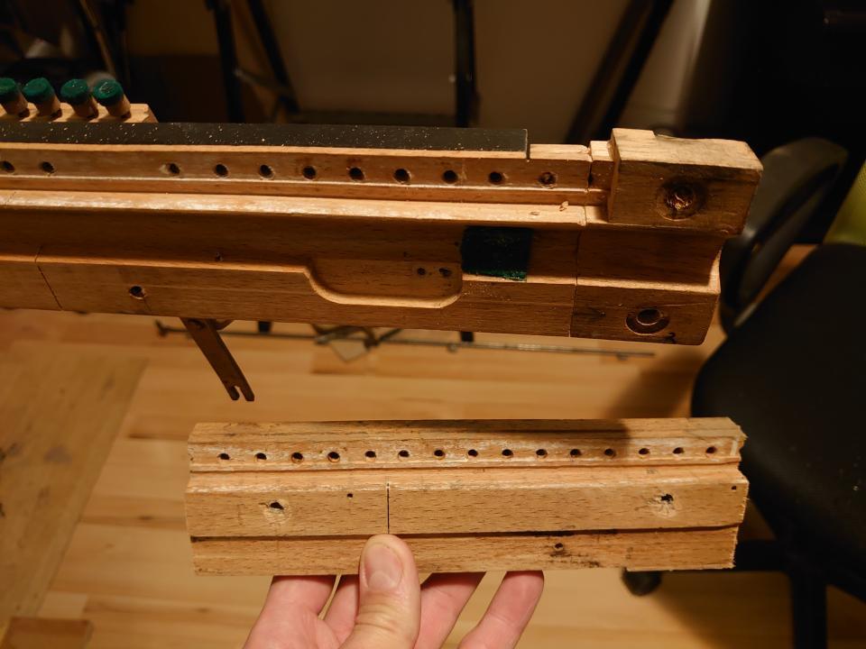 Measuring the spacing of the hammers. At the bottom right, you can see how the felt has been nibbled by moths.Measuring the distance of the action from the strings. An important detail to know where to place the Hulam tones.Then the disassembly could begin – unscrew each individual component, ideally marking where it belonged, and then set it aside. I wasn’t thorough enough with labeling, which later caused me trouble, but I managed to resolve the situation.A pile of hammers and dampers. Everything had to be cleaned of dust and moth remnants.Damper levers and hammer jack mechanisms.The action needed to be shortened to 5 octaves.The same goes for the baseboard.Next, it was necessary to design a frame to hold the action, since I had removed the harp with the strings that held it in the piano. The wall helped me, as I could measure the distance from the wall to the hammers. In the photo, the baseboard hadn’t been shortened yet.The completed celesta base. Already with the hammers installed.