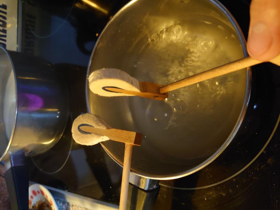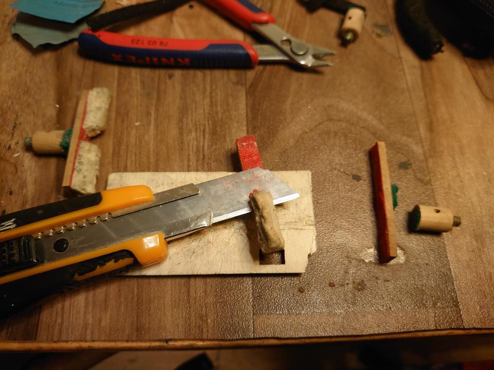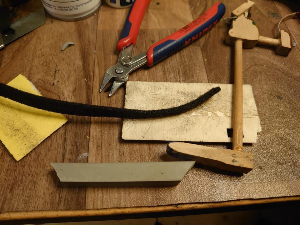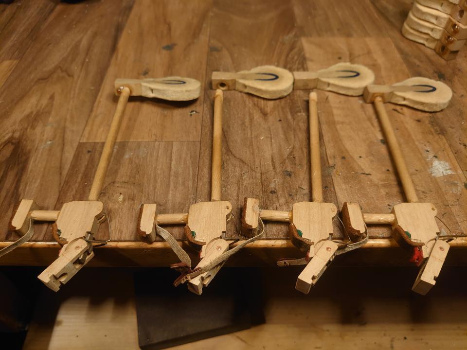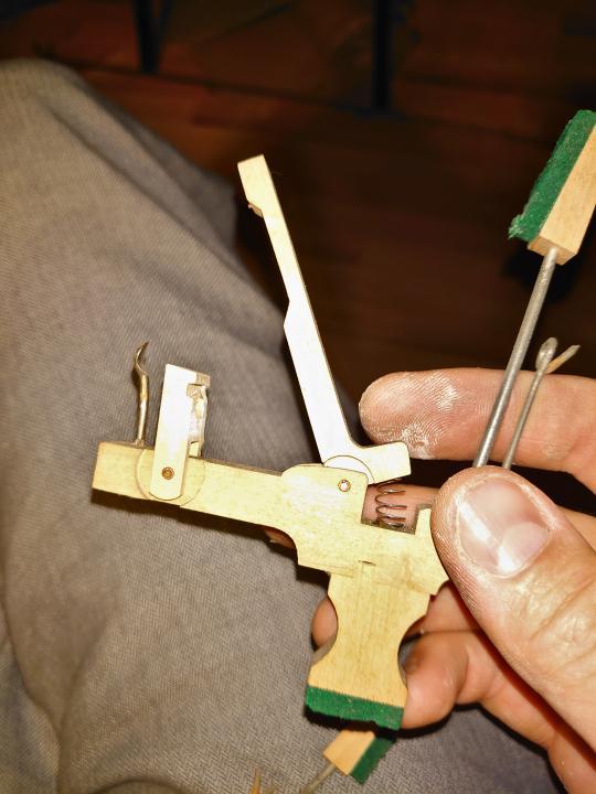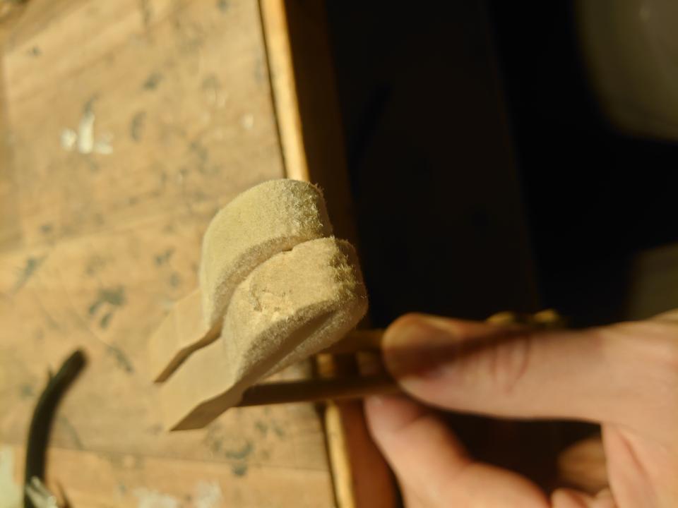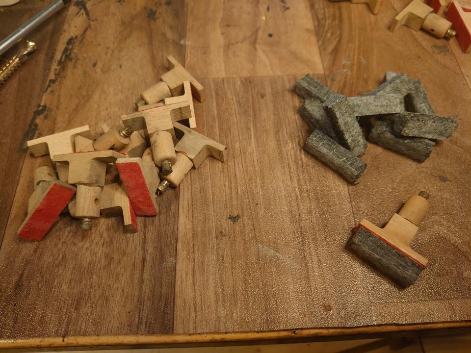 Why do I steam the hammers? They are glued with hide glue, which can be undone with hot steam.Disassembled hammers.3 steps: separate, fill the hole with a peg, drill, and glue again.Next step: The small black felt on the top of the hammer serves as the contact surface for the jack mechanism. These felt squares were almost completely eaten away. The piano would click when a key was released.The hammers were significantly worn. I sanded the striking edge and slightly softened it.The original hammers weren’t suitable for the lower notes. They produced too many high overtones, which I didn’t want to hear. I had to choose a different material, cutting off the original felt and gluing on suitable rubber.Preparing the hammer for the lowest notes.Next in line were the damaged dampers. Just as important a component as the hammer. The hammer sets the note vibrating, and the damper puts it to rest.Gluing new felt onto the dampers. This turned out to be insufficient, so all the dampers had to be redone.Jack mechanism. This piece is mounted between the key and the hammer. All of them had to be checked, loosened, and lubricated if necessary. Some were completely stiff, while others squeaked.Assembling the individually repaired action components.