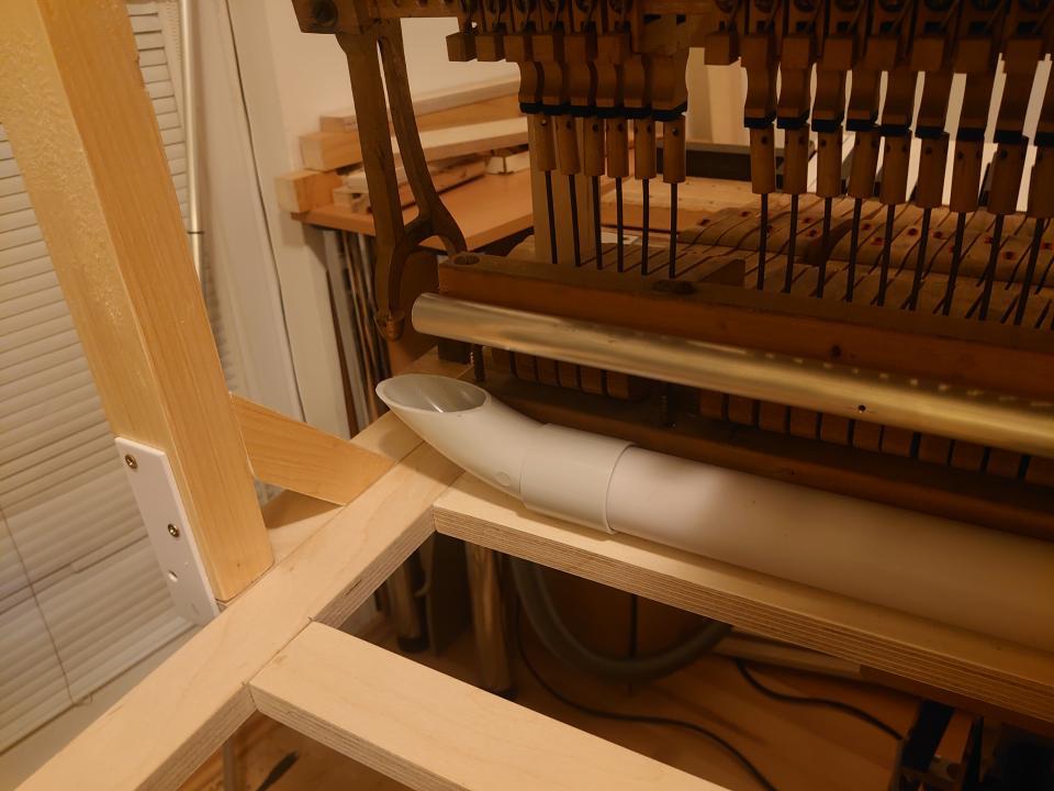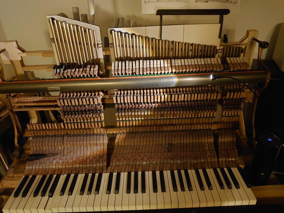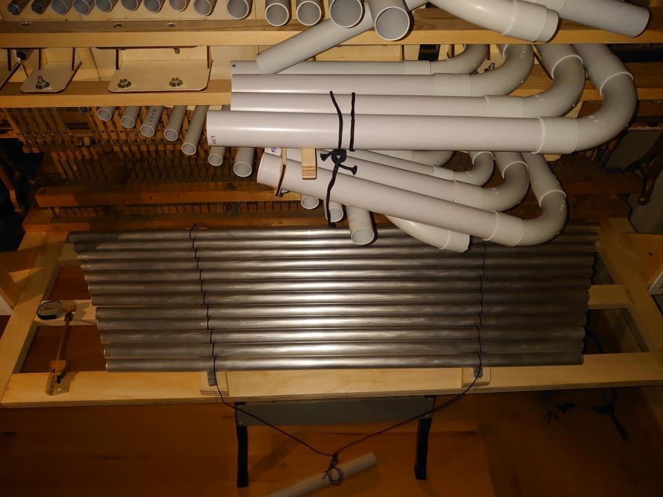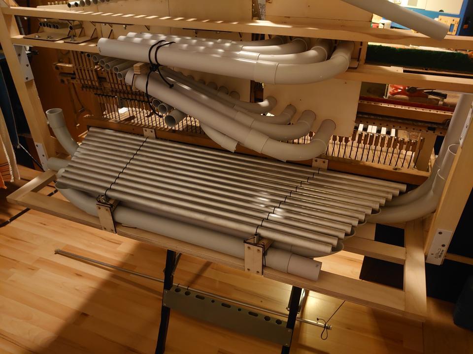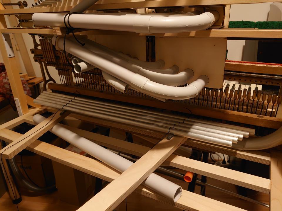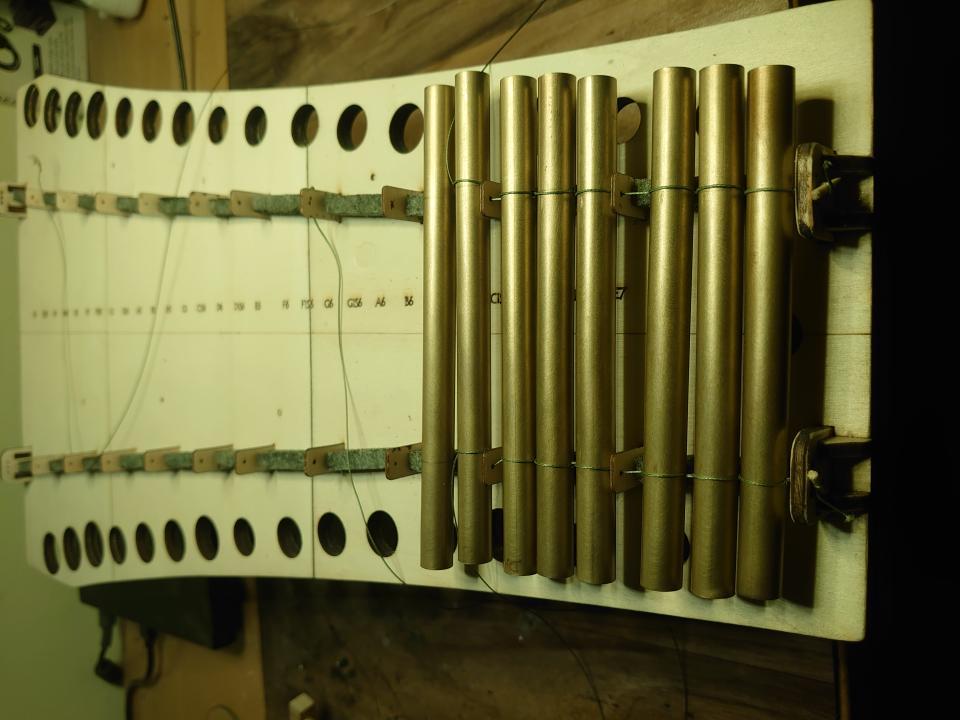 Another thing I had to change compared to the Hulam, which I usually make, was the arrangement of the tones and resonators. The resonators have a larger diameter than the pipes, so it was necessary to choose dimensions that would allow the individual tones to fit next to each other. I tested these proportions on the piano we have at home. All of this happened before I found a donor, so I first determined the maximum possible diameter of the brass tone pipe, compared it with available sizes, and chose the right solution accordingly.