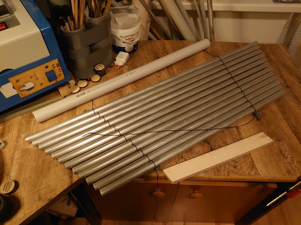 I started by testing the tones. I used aluminum pipes, the same ones I usually use for Hulam tones. Brass tones would have been three times heavier, and at this size, even aluminum had a good sustain.